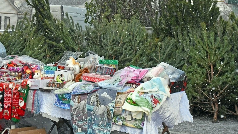 Была у ярмарки одна примечательная особенность: торговым рядам пришлось несколько сдвинуться, чтобы разместить в своих привычных для лета и осени рамках ёлочный базар с его пушистыми красавицами сосенками и новогодними нарядами для них в виде электрических гирлянд, мишуры, игрушек и другой новогодней атрибутики.